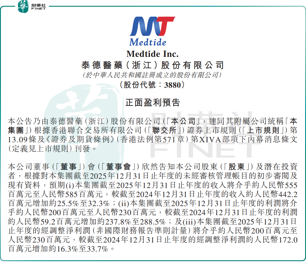 泰德医药发布正面盈利公告,预计2025年泰德医药收入介乎约5.55亿元至5.85亿元(单位人民币,下同),同比增加约25.5%至32.3%。