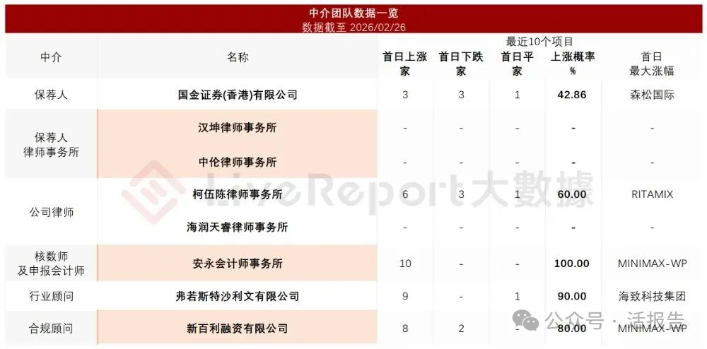 据LiveReport大数据统计,天辰生物中介团队共计8家,其中保荐人1家,近10家保荐项目数据表现不理想;公司律师共计2家,综合项目数据表现普通。整体而言中介团队历史数据表现中规中矩。