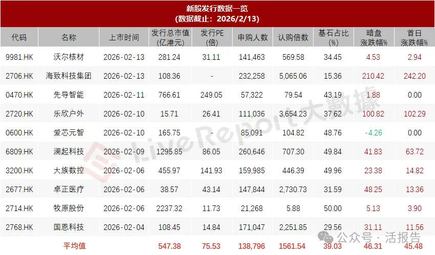 据LiveReport大数据,近10家上市新股平均发行市值为547.38亿,最大市值为牧原股份,最小市值为乐欣户外;平均发行PE为75.53倍,PE水平处于高位;平均申购人数为138,796人,平均认购倍数为1561.54倍;平均基石占比为46.31%,基石平均比例有所回升;