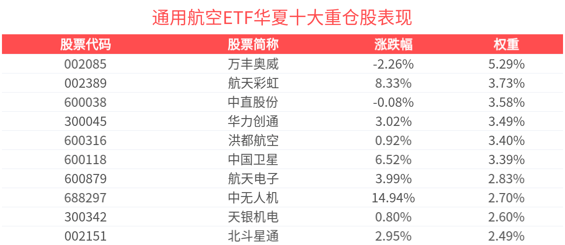 通用航空ETF华夏紧密跟踪国证通用航空产业指数,截至2026年2月27日,国证通用航空产业指数(980076)前十大权重股分别为万丰奥威、洪都航空、中直股份、航天彩虹、天银机电、航天电子、华力创通、中国卫星、应流股份、中无人机,前十大权重股合计占比34.1%。