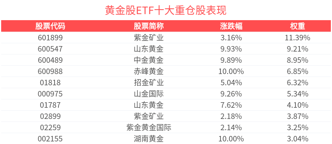 黄金股ETF紧密跟踪中证沪深港黄金产业股票指数,覆盖黄金采掘、冶炼、销售等龙头企业,截至2026年2月27日,中证沪深港黄金产业股票指数(931238)前十大权重股分别为紫金矿业、中金黄金、山东黄金、赤峰黄金、招金矿业、山金国际、湖南黄金、紫金黄金国际、紫金矿业、山东黄金,前十大权重股合计占比61.77%。