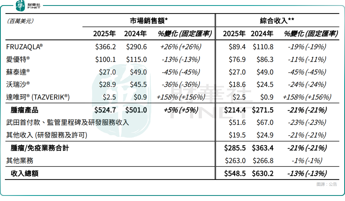 2025年全年,FRUZAQLA®的综合收入为8940万美元,同比下降19%,出现了显著下降。