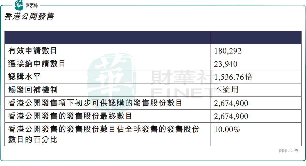 从招股阶段的表现来看,香港公开发售方面,兆威机电获1536.76倍认购,公开发售的发售股份最终数目为267.49万股股份,占发售股份总数的约10%。有效申请数目约为18.03万份,受理申请数目约23940份,申购一手(100股)获配发股份占所申请股份总数的概约百分比为4%。