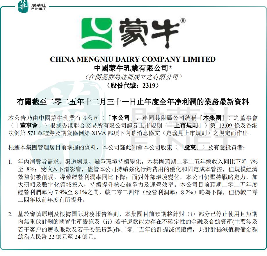 蒙牛强调,上述预期计提减值拨备或亏损金额并不会对公司目前和未来的营运以及现金流产生重大不利影响,预期公司2025年经营现金流同比表现稳健。