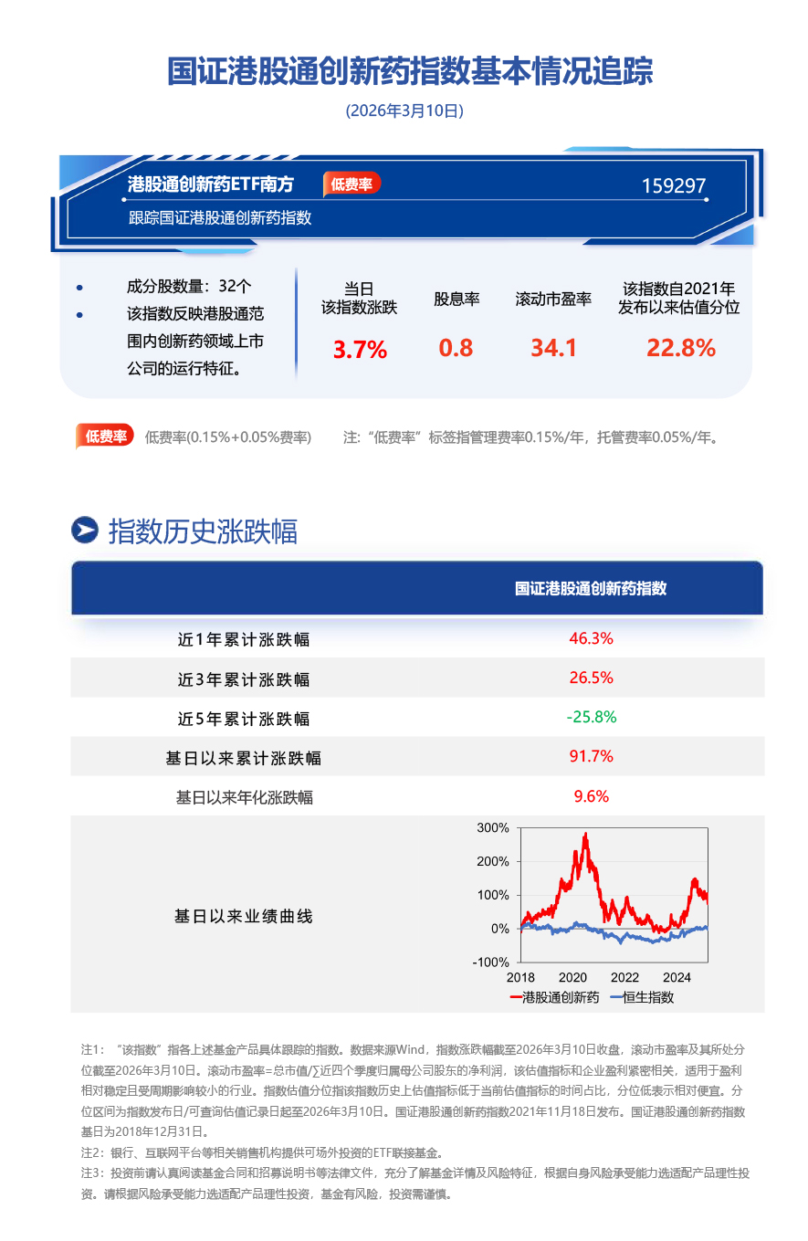 3月10日,受地缘风险缓和影响,港股创新药板块走强,在相关权重股强势带动下,国证港股通创新药指数(987018)亦整体走强。截止收盘,指数上涨3.7%,成交额94.33亿元,港股通创新药ETF南方(159297)成交额达1.34亿元,换手率8.12%,市场交投活跃。