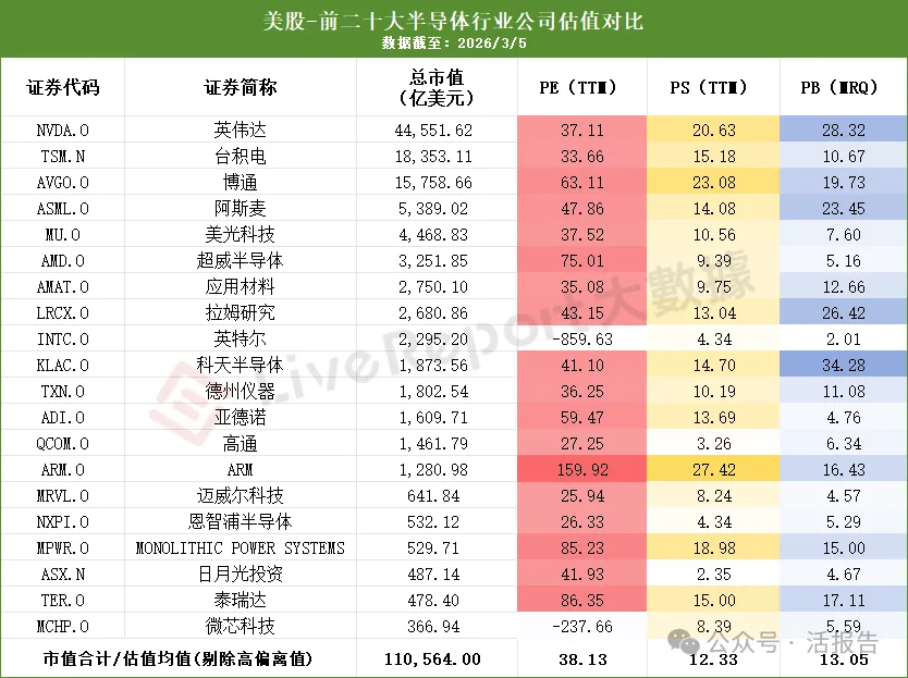从估值数据看,美股前二十大半导体公司总市值合计高达11.05万亿美元,呈现出显著的“头部集中”特征。