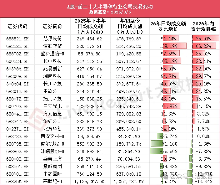 全线放量,但方向不同,除中芯国际、寒武纪、豪威等少数龙头外,A股绝大多数半导体标的成交额大幅增长,佰维存储、长电科技、芯原股份等成交额翻倍以上,显示增量资金正在涌入板块。