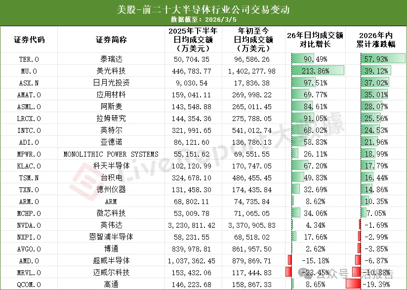 美股半导体板块呈现与港股、A股截然不同的资金流向特征,头部巨头成交增长乏力甚至萎缩,而二线龙头及周期反转标的受到资金热捧。
