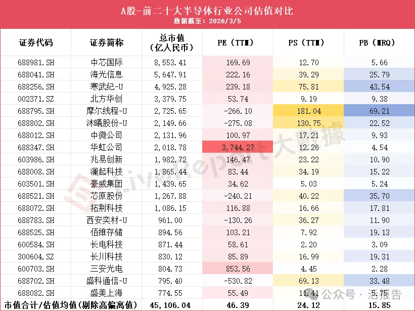 A股前二十大半导体公司总市值为4.51万亿人民币,估值呈现明显的“金字塔”结构,且政策驱动特征极为显著。