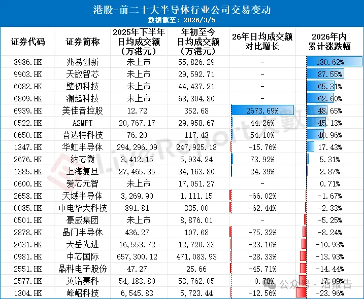 2026年新上市的半导体企业集体吸金,兆易创新、天数智芯、壁仞科技、澜起科技均为2026年初新上市标的,上市后即获得极高流动性,四只个股日均成交合计近20亿港元,且年内涨幅全部超过60%,兆易创新更是得益于存储周期驱动累计上涨130.62%。