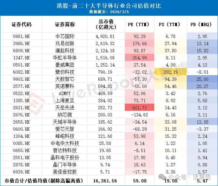 整体看,ASMPT(0522.HK)等传统封测企业PS仅3.42倍,与国际同类相比明显折价。而南下资金与产业资本则热捧国产AI芯片,导致板块内部估值离散度极大。剔除极端值后,港股整体PE为59.08倍,PS为19.08倍,PB为5.47倍。