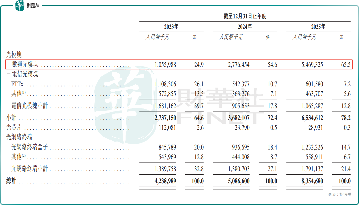 不过,从业务层面来看,业绩增长的核心驱动力来自数通光模块业务。受益于AI及云计算相关应用的市场需求激增,公司数通光模块收入从2023年的10.56亿元大幅增长至2025年的54.69亿元,占总收入的比例从24.9%飙升至65.5%,成为绝对的收入支柱,业务的集中度出现了持续提升。
