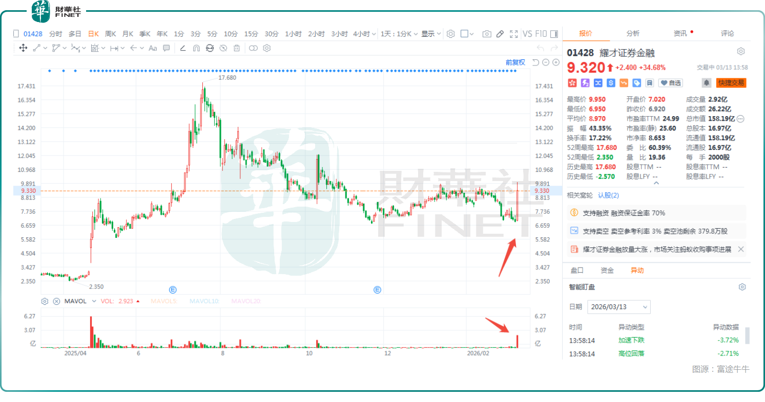 3月13日,耀才证券金融(01428.HK)在录得高开之后,一路向上猛攻,截至发稿时间飙涨近35%,其成交额也出现显著放大,引起了投资者的广泛关注。