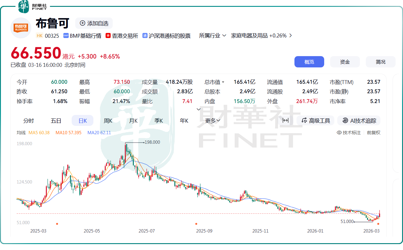 业绩发布后,3月16日,布鲁可股价大幅拉升,截至收盘,涨幅为8.65%,报66.55港元/股。