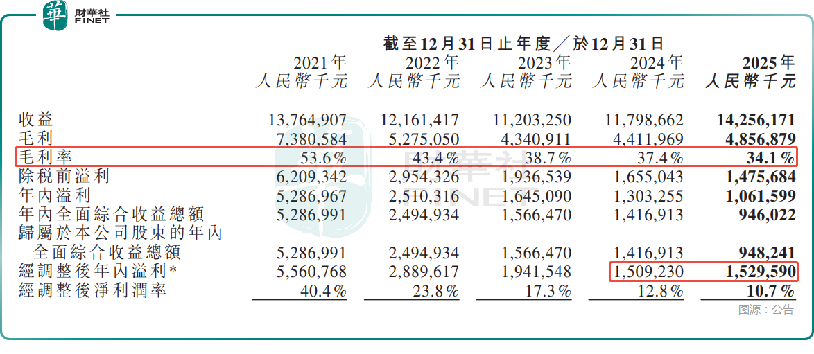 一方面,毛利率持续下滑,盈利底盘被侵蚀。数据显示,2025年公司的毛利率继续下降至34.1%,远不如早年超过50%的水平。
