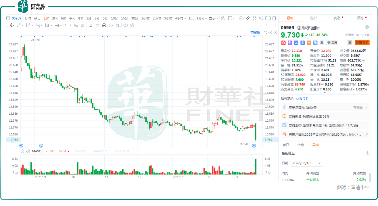 3月18日,思摩尔国际(06969.HK)、腾讯音乐-SW(01698.HK)、健康160(02656.HK)等多股出现显著下跌。其中,思摩尔国际在盘中出现“跳水式”暴跌,截至发稿时间放量大挫逾18%,且跌破了最近几个月的盘整区间。
