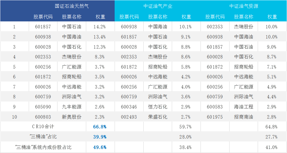 表:国证石油天然气指数龙头成份股集中度更高,“三桶油”权重暴露更多