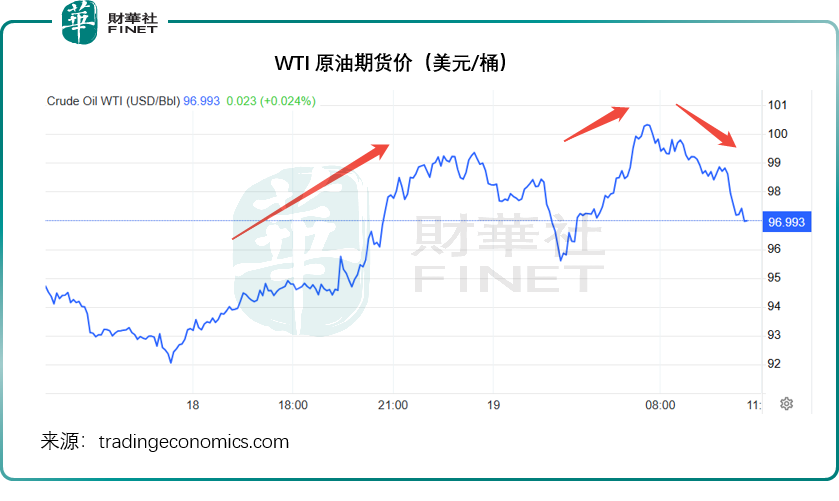 值得留意的是,在议息结果公布前夕,中东地缘风险陡然加剧,油价急涨,见下图,WTI原油期货价从亚洲交易时段的90美元突破100美元,随后回落,但仍在接近97美元的水平徘徊。