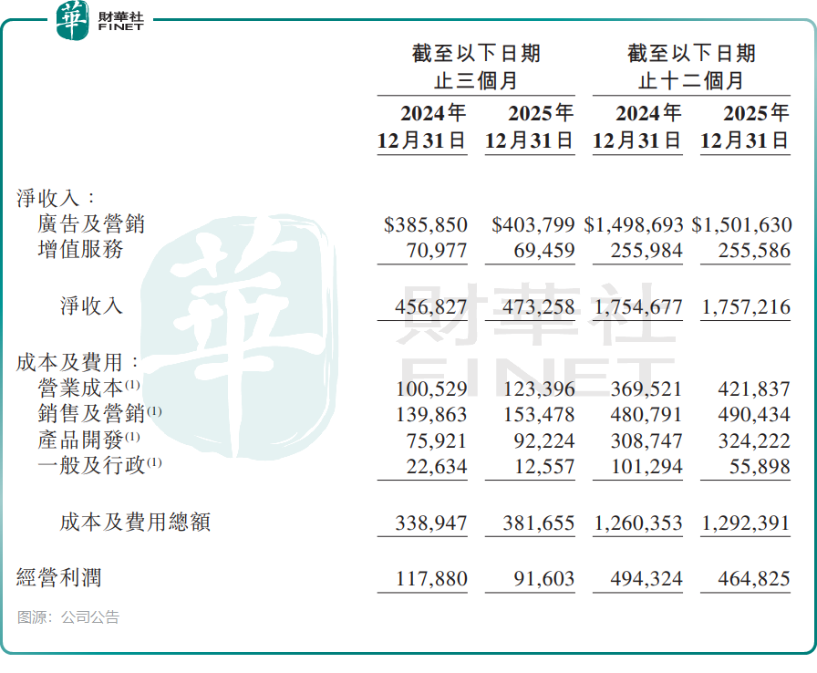 与全年归母净利润49%的高增长形成鲜明反差的,是微博主营业务的增长乏力。作为平台收入核心支柱的广告及营销收入在2025年录得15亿美元,同样与上年持平,这意味着公司主营业务在2025年并未实现实质性的规模扩张。
