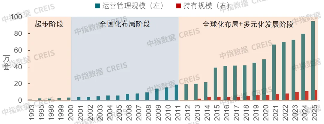 Greystar于1993年在美国创立,经历区域起步、全国化布局、全球化及多元化探索发展等阶段后,已成长为美国规模最大的公寓运营商,业务覆盖北美、欧洲、南美与亚太地区。从核心经营指标来看,截至2025年初,Greystar在美国管理租赁房源约94.7万套,连续15年位居全美第一;其中自持租赁房源约12.3万套,亦居美国租赁机构首位。业务模式上,Greystar以轻资产运营为主,自持房源在管理规模中的占比长期保持在15%以下,形成了轻资产化拓展业务规模的发展特征。