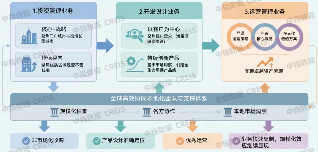 Greystar主流业务涵盖投资管理、开发设计与运营管理三大板块,构建了全链条垂直一体化的商业模式。Greystar垂直一体化商业模式的核心优势在于全链条的协同效应,其中投资环节的区位与产品判断为开发建设提供精准导向,开发阶段的产品品质管控为运营管理奠定基础,而运营过程中积累的租户需求数据又反向优化投资与开发策略,形成了互相赋能的商业闭环。