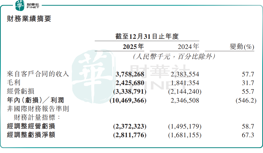 财报显示,巨额的研发投入,叠加优先股及金融负债公允价值变动等非经营性因素影响,公司年内亏损达104.69亿元,由盈转亏(2024年盈利23.47亿元),经调整经营亏损为23.72亿元,亏损同比增长58.7%;综合毛利率也有所回落,降至64.5%,较上年同期下滑12.8个百分点。
