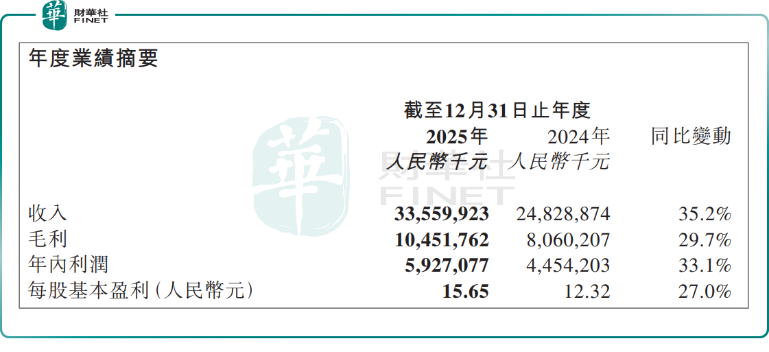 当日午间,蜜雪集团发布2025年全年业绩。公告显示,公司全年实现收入335.6亿元,同比增长35.2%;年内利润59.27亿元,同比增长33.1%,营收与利润均实现高速增长。