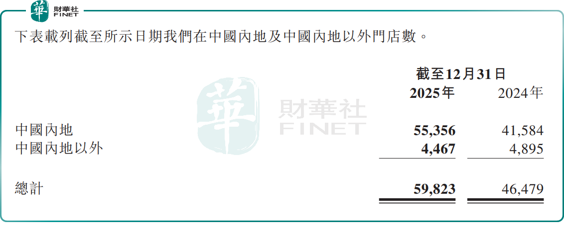 截至2025年末,蜜雪集团全球门店总数达59823家,覆盖中国及海外13个国家,年内净增门店13344家。