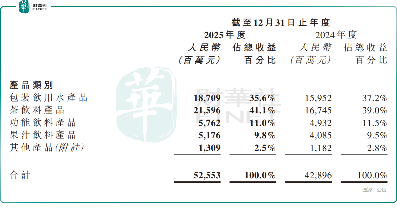 2025年,即饮茶类产品以215.96亿元的收入坐稳第一大品类,同比增速达29.0%,收入占比也提升至41.1%,成为增长最快的核心引擎。近些年来,茶饮料兴起,成为饮料市场中表现极为亮眼的一个细分品类,而农夫山泉旗下的“东方树叶”持续畅销给业绩增长提供了关键助力,去年5月,“东方树叶”上市“陈皮白茶”和“菊花普洱”新口味,进一步完善在六大茶类中的产品布局。