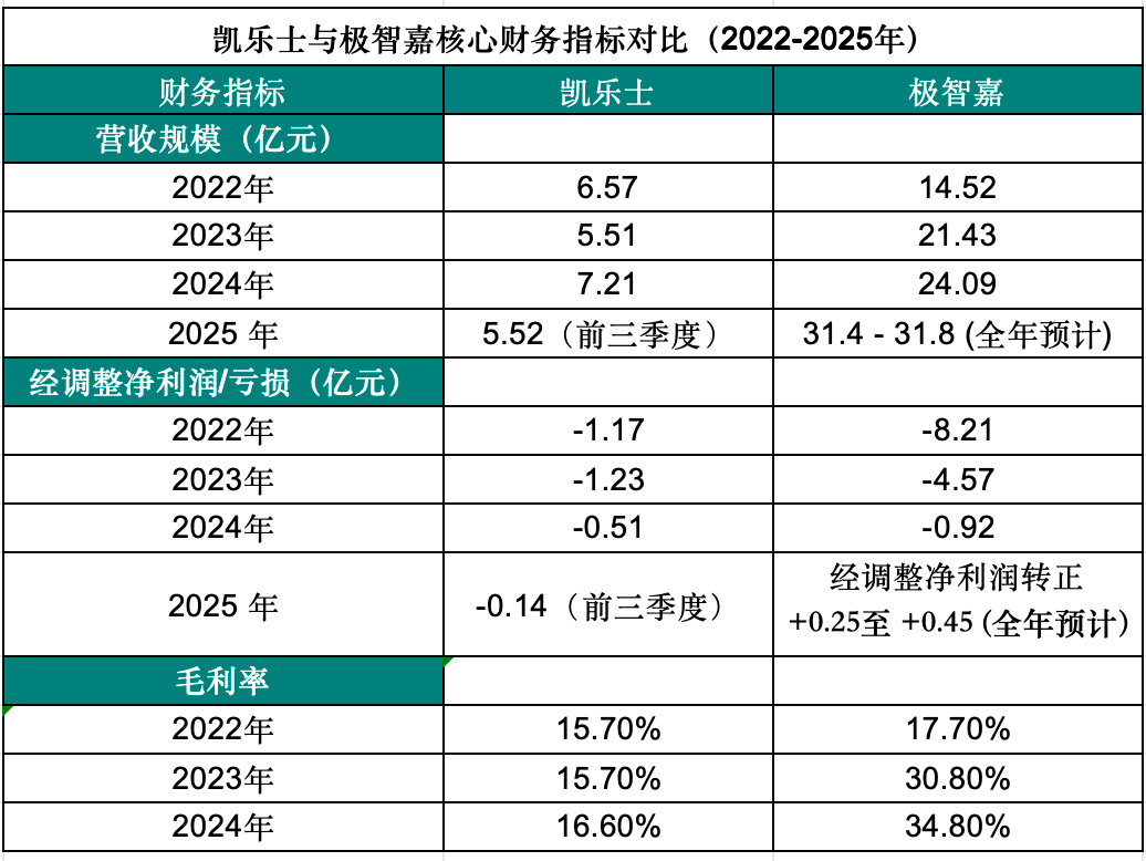 凯乐士与极智嘉核心财务指标对比(2022-2025年)