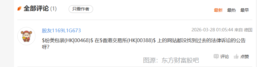 在东方财富纷美包装股吧,已有投资者关注到,纷美包装在港交所发布的过往公告中,未披露该起涉诉案件的相关信息,并质疑。
