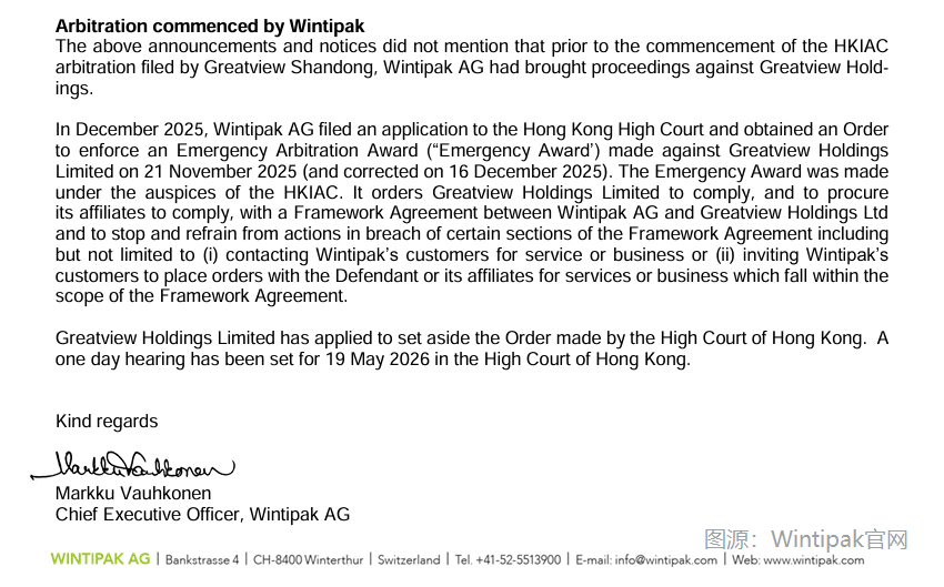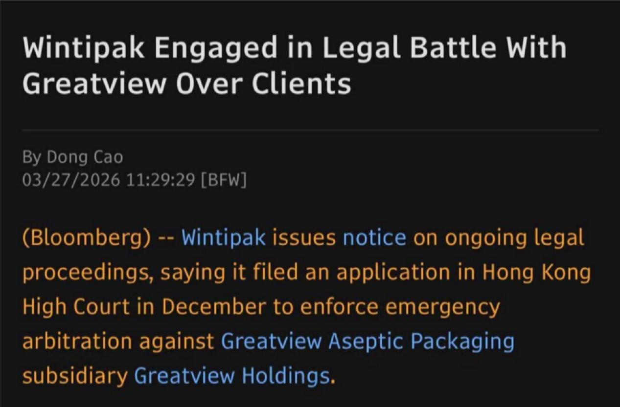 据彭博3月27日消息,Wintipak与纷美包装(00468.HK)就客户问题陷入法律战。其中,Wintipak就正在进行的法律诉讼发布公告,称其已于12月向香港高等法院提出申请,要求对 Greatview Aseptic Packaging(纷美包装)的子公司 Greatview Holdings 执行紧急仲裁。纷美则申请撤销高等法院的该项命令。此外,纷美已在香港和上海对 Wintipak及相关方提起了仲裁诉讼。