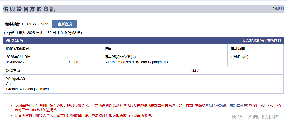 从香港司法机构官网公开信息核实确认,纷美包装间接全资附属公司 Greatview Holdings Limited(丰景集团有限公司)与Wintipak AG,共同涉及香港高等法院案号为HCCT 228/2025的诉讼案件,开庭聆讯定于2026年5月19日。
