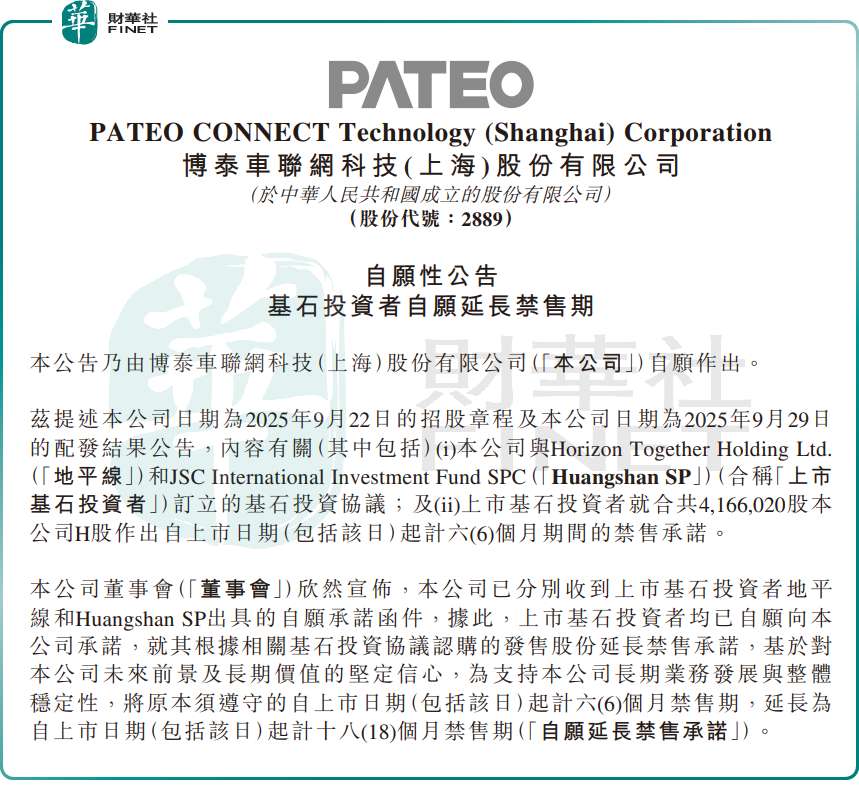 博泰车联披露的自愿性公告显示,基石投资者Horizon Together Holding Ltd.与Huangshan SP 基于对公司未来前景及长期价值的坚定信心,主动将股份禁售期从6个月延长至18个月。同日,公司董事会决议建议采纳H股股份激励计划。