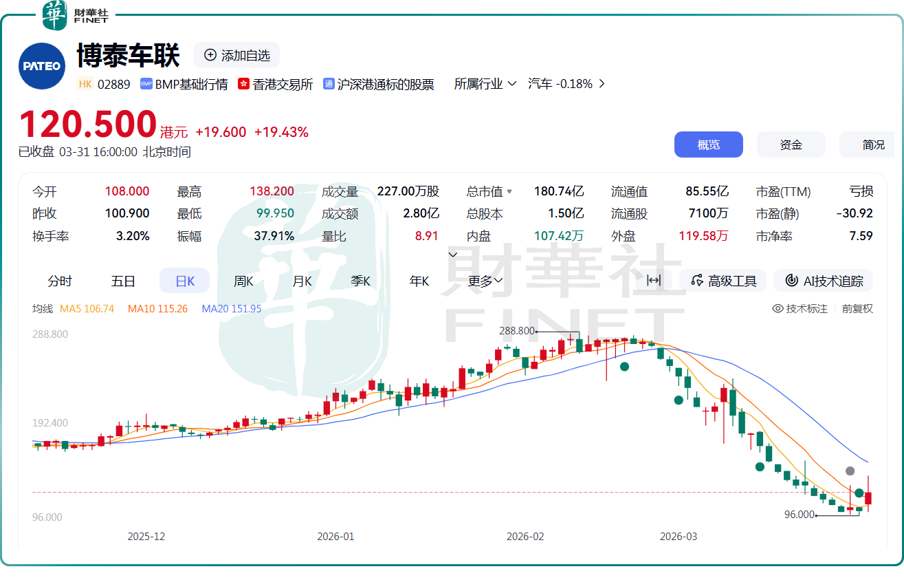3月31日,博泰车联(02889.HK)午后突然放量拉升,一度涨逾36.96%;截至收盘,该股涨幅为19.43%,报120.5港元/股。