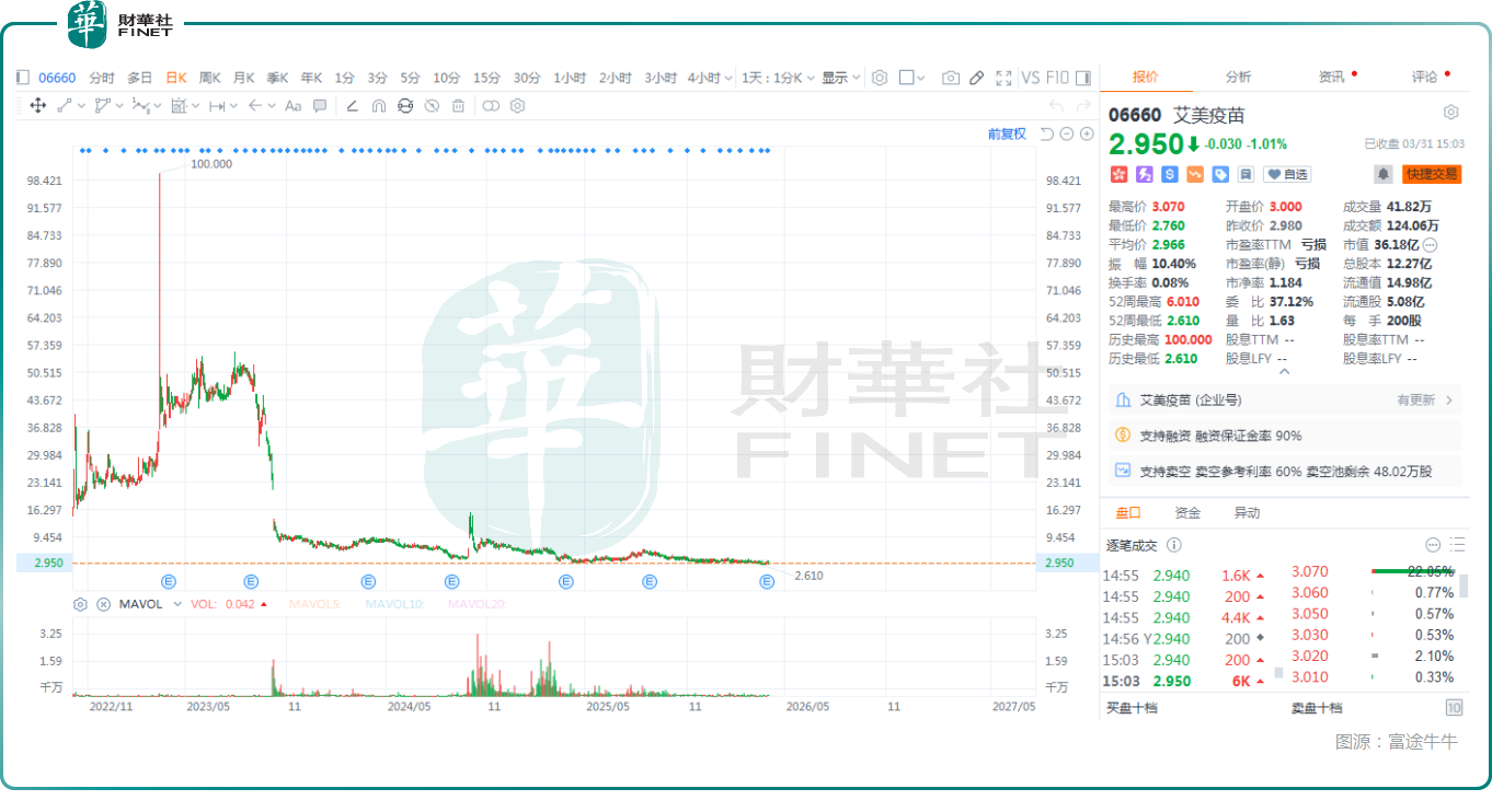 值得一提的是,艾美疫苗已经于2022年10月登陆港交所主板,其股价一度涨至100港元,但此后遭遇显著下跌,截至3月31日收盘已经缩水至2.95港元,市值也跌至了36.18亿港元,表现相当惨淡。