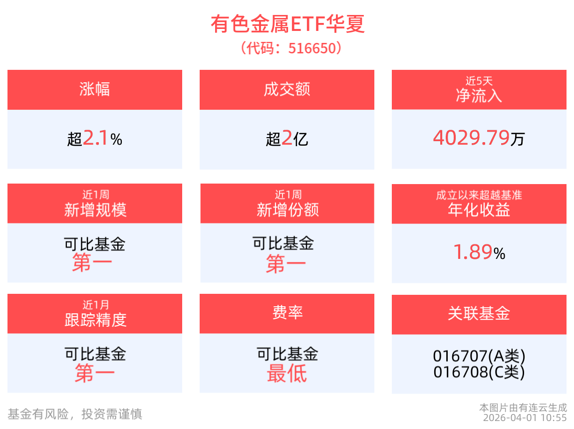 截至2026年4月1日 ,受美伊局势缓和利好,A股三大指数集体走强,截至10:55,有色金属ETF华夏(516650)上涨2.12%,其持仓股洛阳钼业上涨5.07%,中孚实业上涨4.30%,赤峰黄金上涨4.22%,紫金矿业,西部矿业等个股跟涨。