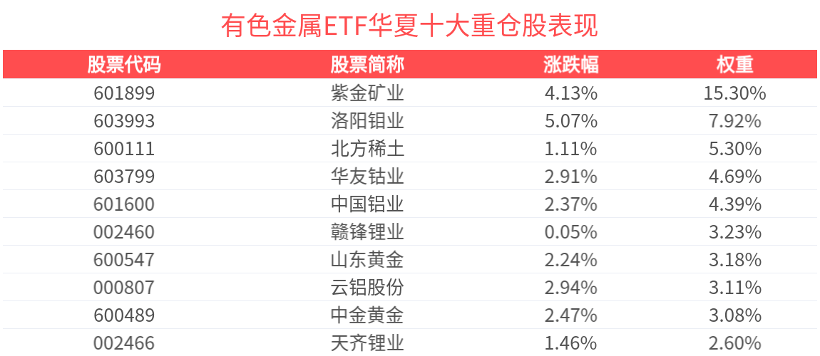 有色金属ETF华夏紧密跟踪中证细分有色金属产业主题指数,截至2026年3月31日,指数前十大权重股分别为紫金矿业、洛阳钼业、北方稀土、中国铝业、华友钴业、赣锋锂业、中金黄金、山东黄金、赤峰黄金、云铝股份,前十大权重股合计占比50.78%。