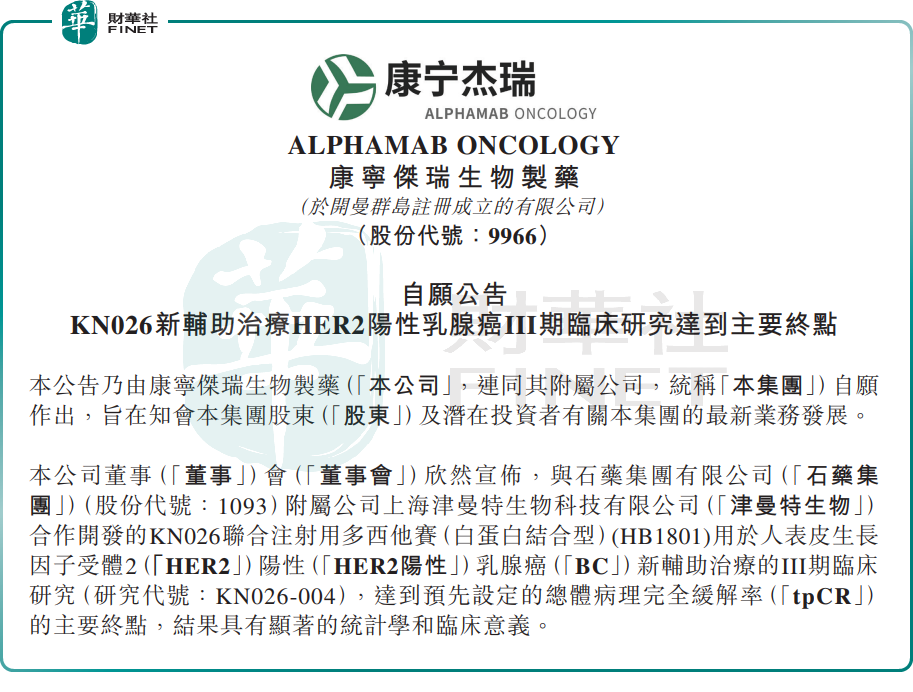 3月31日,康宁杰瑞生物制药发布公告宣布,与石药集团附属公司津曼特生物合作开发的KN026联合注射用多西他赛(白蛋白结合型)(HB1801),用于人表皮生长因子受体2(HER2)阳性乳腺癌(BC)新辅助治疗的III期临床研究(KN026-004),达到预设总体病理完全缓解率(tpCR)主要终点,结果具显著统计学和临床意义。