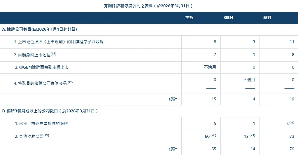 2026年前3月,共有79家上市公司停牌3个月或以上,其中65家为主板上市公司,14家为GEM(创业板)上市。主板中5家公司已获上市委员会批准除牌。