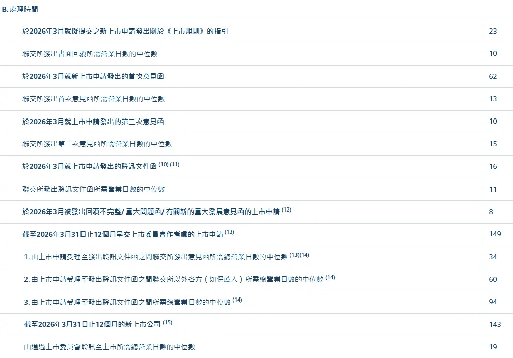 处理时间方面,2026年前3月,港交所发出首次意见函的营业日中位数为13天,发出二次意见函的营业日中位数为15天,发出聆讯文件函所需的营业日中位数为11天。由上市申请受理至发出聆讯文件函之间联交所发出意见函所需总营业日数的中位数是34天。