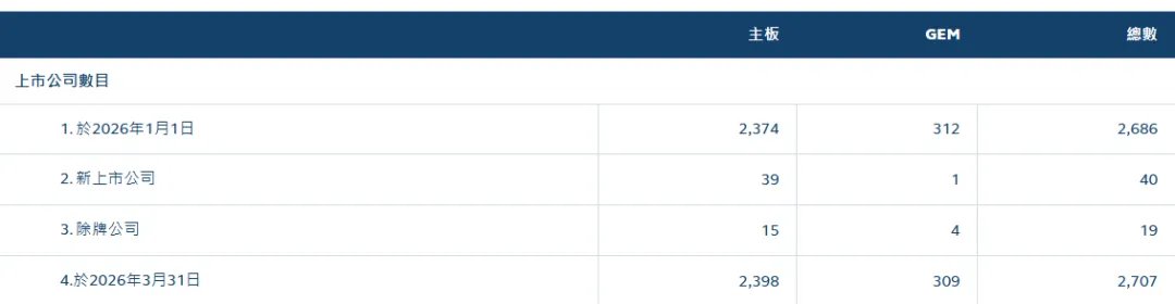 2026年前3月,共有40只新股上市(包含39只主板、一只GEM板)。截至2026年3月31日港股共有2707家,其中主板共2398家,GEM共309家。