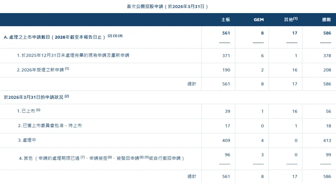 2026年3月31日,港交所公布了有关首次公开招股申请、除牌和停牌公司之报告(2026年3月)。