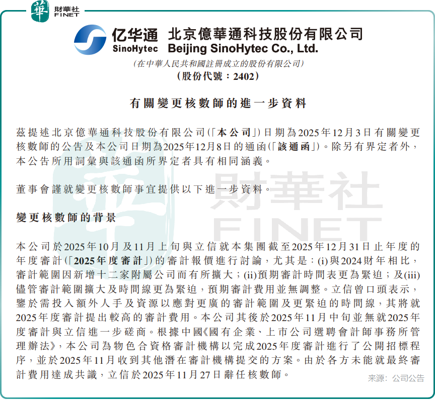 官方给出的理由是“审计费用未能达成一致”。但细究之下,原因颇为复杂:2025年,亿华通新增了12家子公司,审计范围大幅扩大,工作量陡增。在时间紧、任务重的情况下,立信提出提价,而公司并未接受。