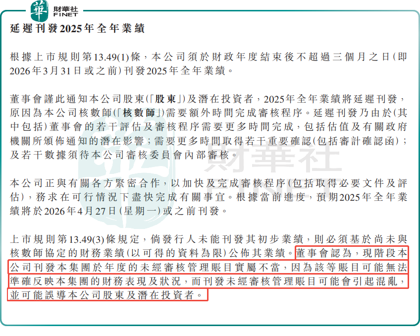 一个耐人寻味的细节是,公司于3月31日明确表示,现阶段刊发未审核管理账目“实属不当”,因为可能“无法准确反映财务表现及状况”,甚至“可能误导”投资者。而公司发布2025年未经审核的业绩快报的时间是在2月27日。