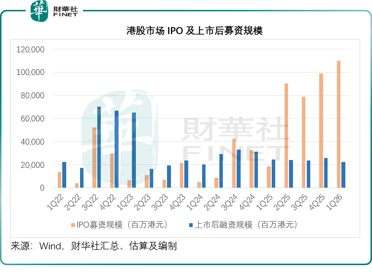 与二级市场的谨慎形成鲜明对比,2026年第1季的港股IPO市场迎来了“高光时刻”,首发募资总额突破1,099亿港元,较上年同期激增近5倍。