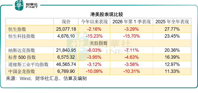大盘走势出现了显著的防御特征。恒生指数(HSI.HK)作为蓝筹大本营,第1季下跌3.29%,虽然录得负收益,但其表现明显优于科技成长板块,且稍微跑赢美股的蓝筹指数道琼斯工业平均指数(DJI.US)约-3.58%。相比之下,恒生科技指数(HSTECH.HK)重挫15.70%,不仅大幅跑输恒生指数,更显著跑输美股科技股指数纳斯达克指数-7.11%。