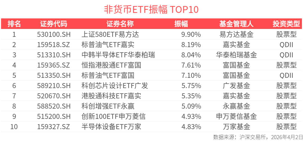 截至今日收盘,上证580ETF易方达、标普油气ETF嘉实、中韩半导体ETF华泰柏瑞振幅居市场前列,分别达9.90%、8.19%、8.04%。