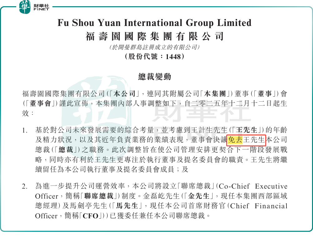 2025年12月12日,福寿园突然宣布重大人事调整——免去王计生总裁职务,设立联席总裁制,由金磊屹、马剑亭共同执掌运营与财务大权。
