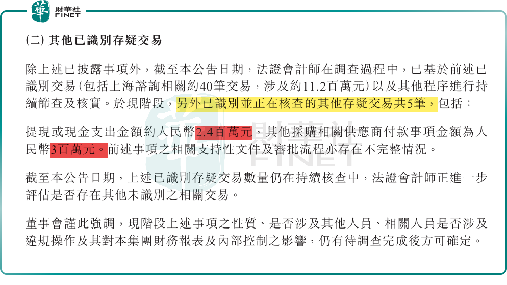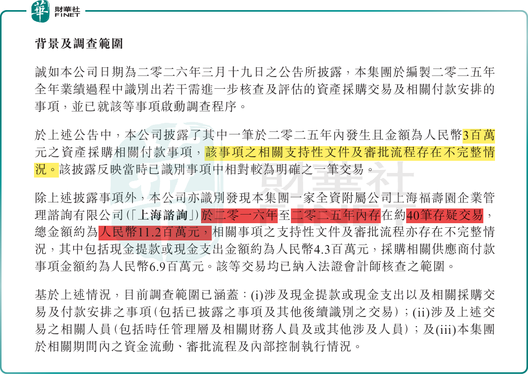 根据公告,除了上述的300万元外,公司在内部调查中发现了更大规模的存疑交易。旗下全资附属企业上海福寿园企业管理咨询有限公司在2016-2025年内存在约40笔存疑交易,合计1120万元;在调查推进中再新增5笔可疑交易,包括提现或现金支出金额约240万元,其他采购相关供应商付款事项金额为300万元。